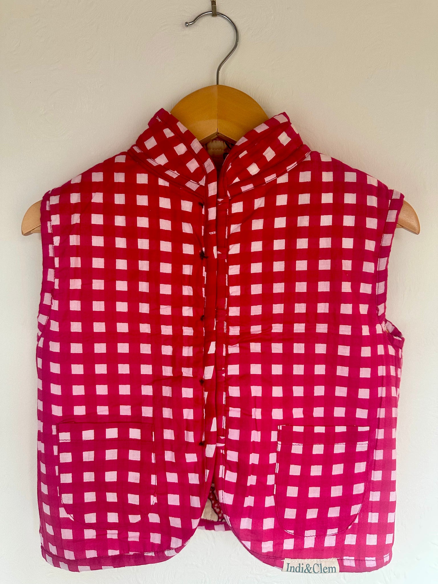 100% Cotton quilted gilet. Toggle buttons are on the main side, but you can still fasten for wearing on the stripy side.