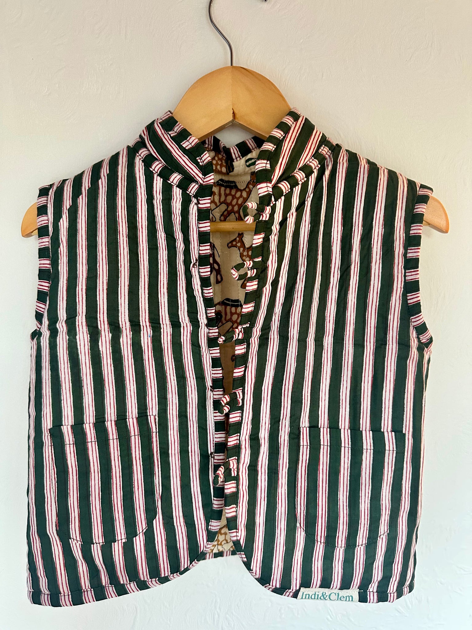 100% Cotton quilted gilet. Toggle buttons are on the main side, but you can still fasten for wearing on the stripy side.