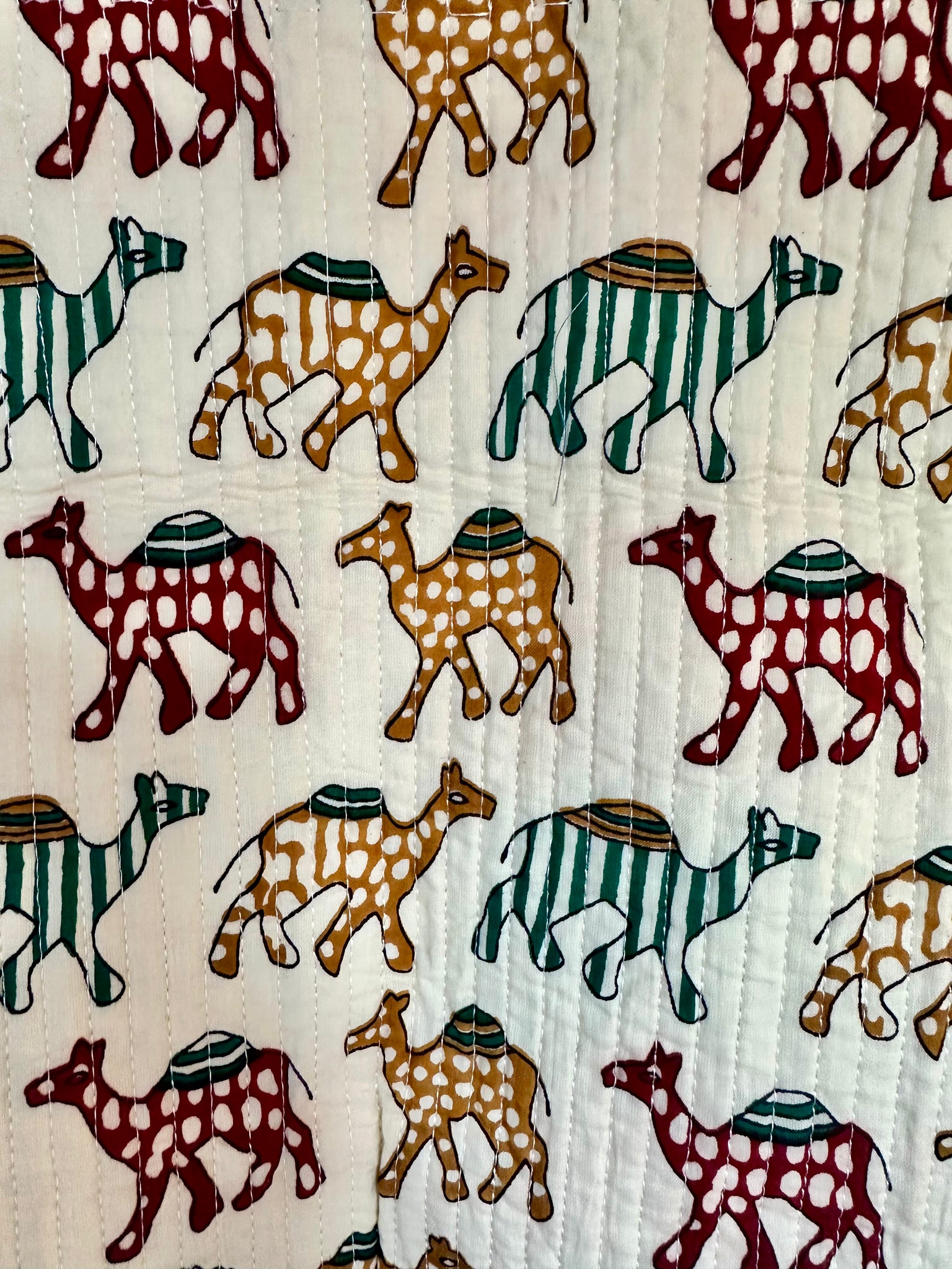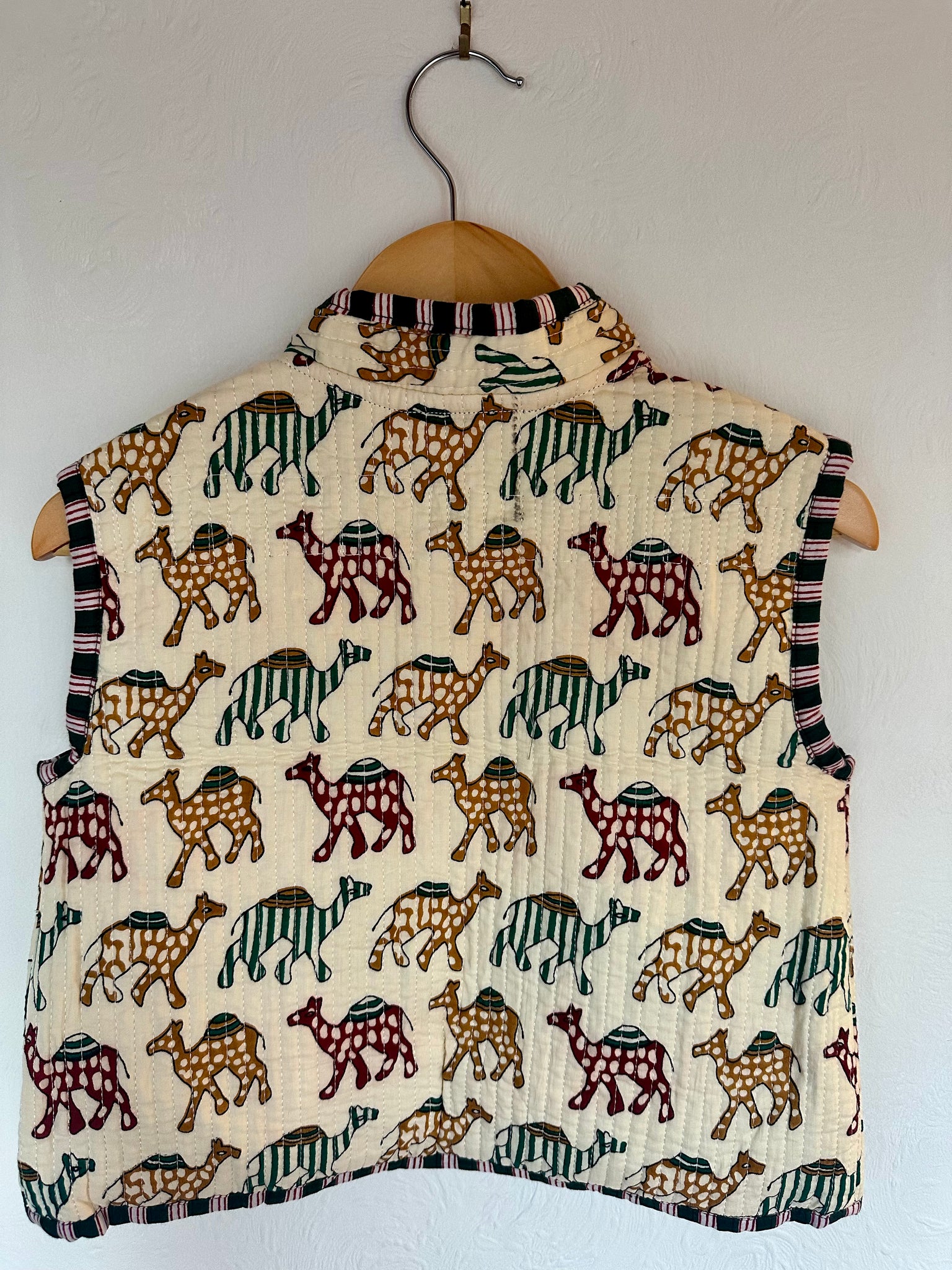 A joyful quilted waistcoat in the Camel Parade print - a colourful caravan of camels brought to life in hand drawn detail with complimenting print on reverse side.